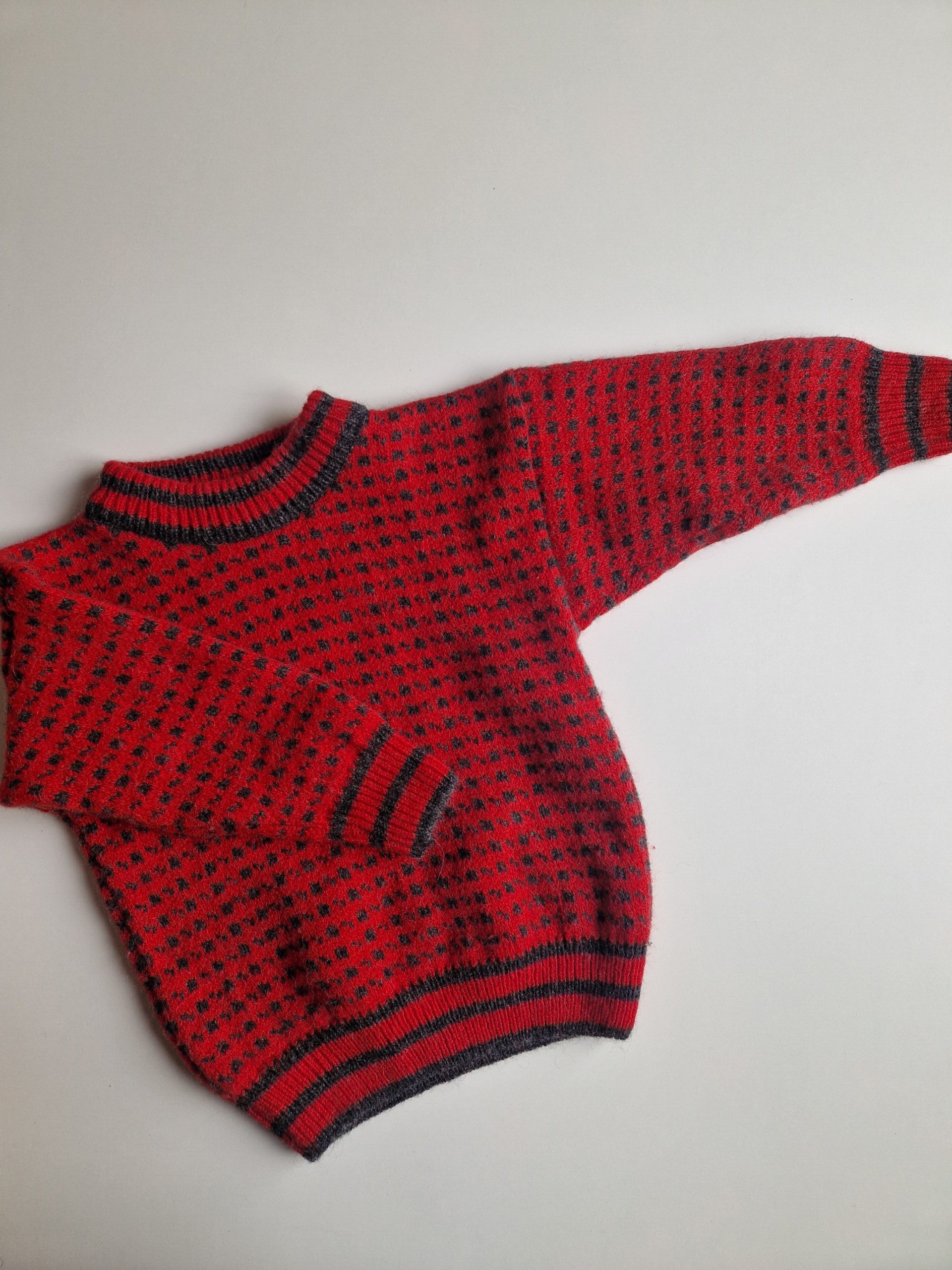 Röd och grå ull-tröja från Giestal exclusive. Storlek 2-4 och jag bedömer som rymlig 104 och normal 110. 100% norsk ull. Den är preloved men fin- kanske lite krympt … svårt att avgöra- kanske känns lite så i ärmar. I vilket fall en underbar så kallad norsk fiskartröja.