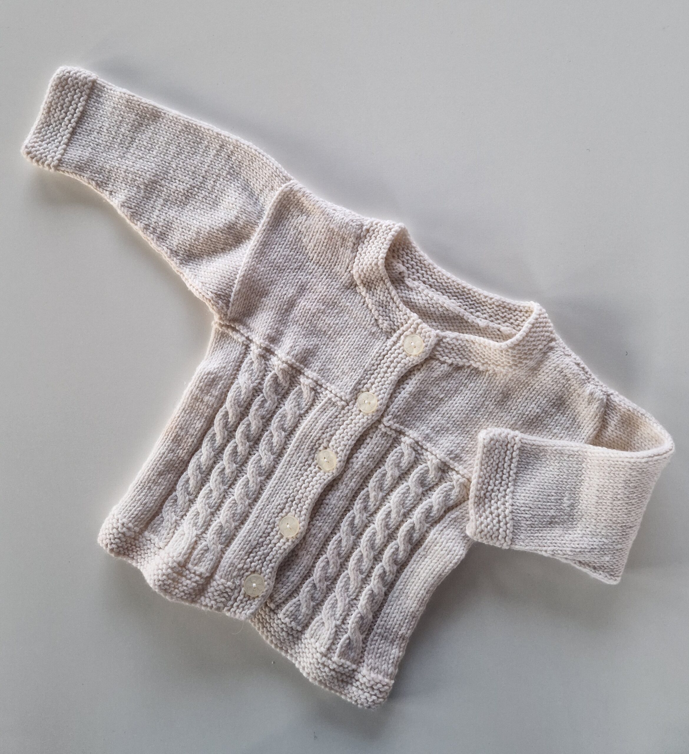 Vaniljvit handgjord kofta med fina knappar. Perfekt skick. Mycket mjukt garn, material ej angivet. Passar bäst runt 74 men fungerar även 68 och upp till 80 när den bärs öppen.