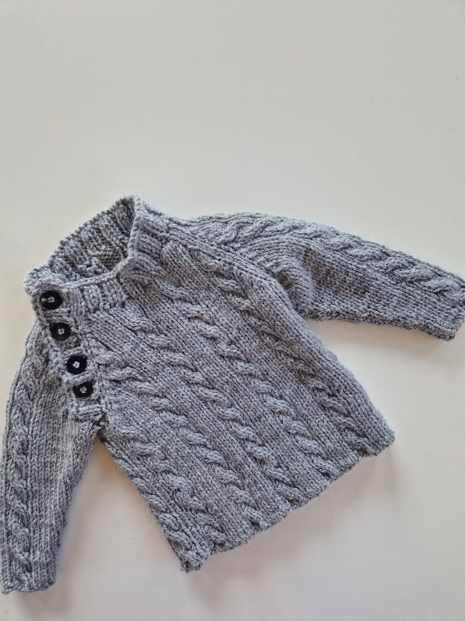 Handgjord tjock!  tröja som knappt aldrig använts. Välgjord. Ull-blandning. Är nog mest 74 men funkar runt denna storlek beroende på hur den ska sitta. Storlek 68 stor men kan gå, 80 lite tight men funkar uppknäppt.