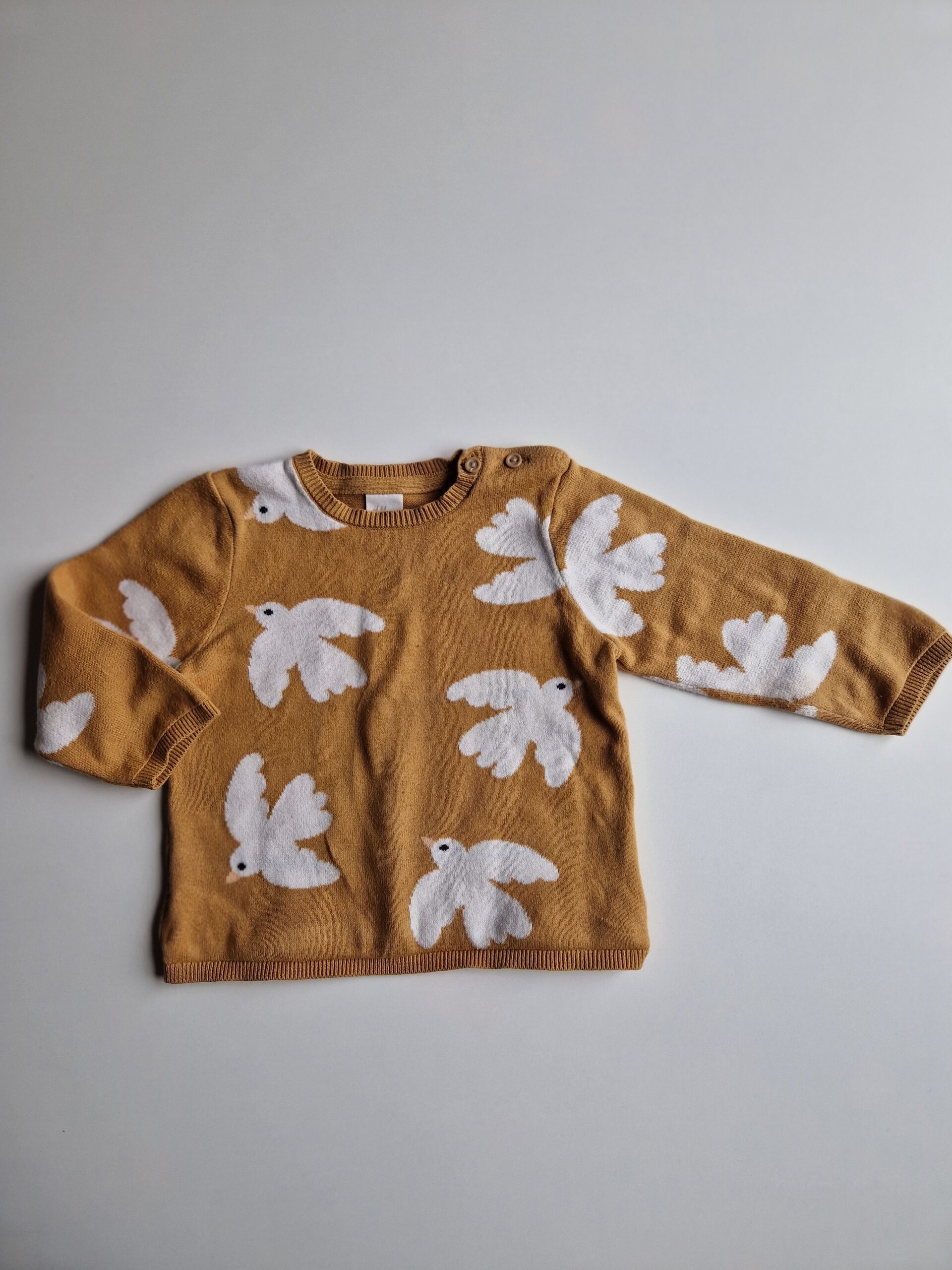 Stickad tröja i ekologisk bomull med grafiskt duvmotiv. Ett litet masterpiece med fina färger och ett uttryck som sticker ut. Bra begagnat skick.