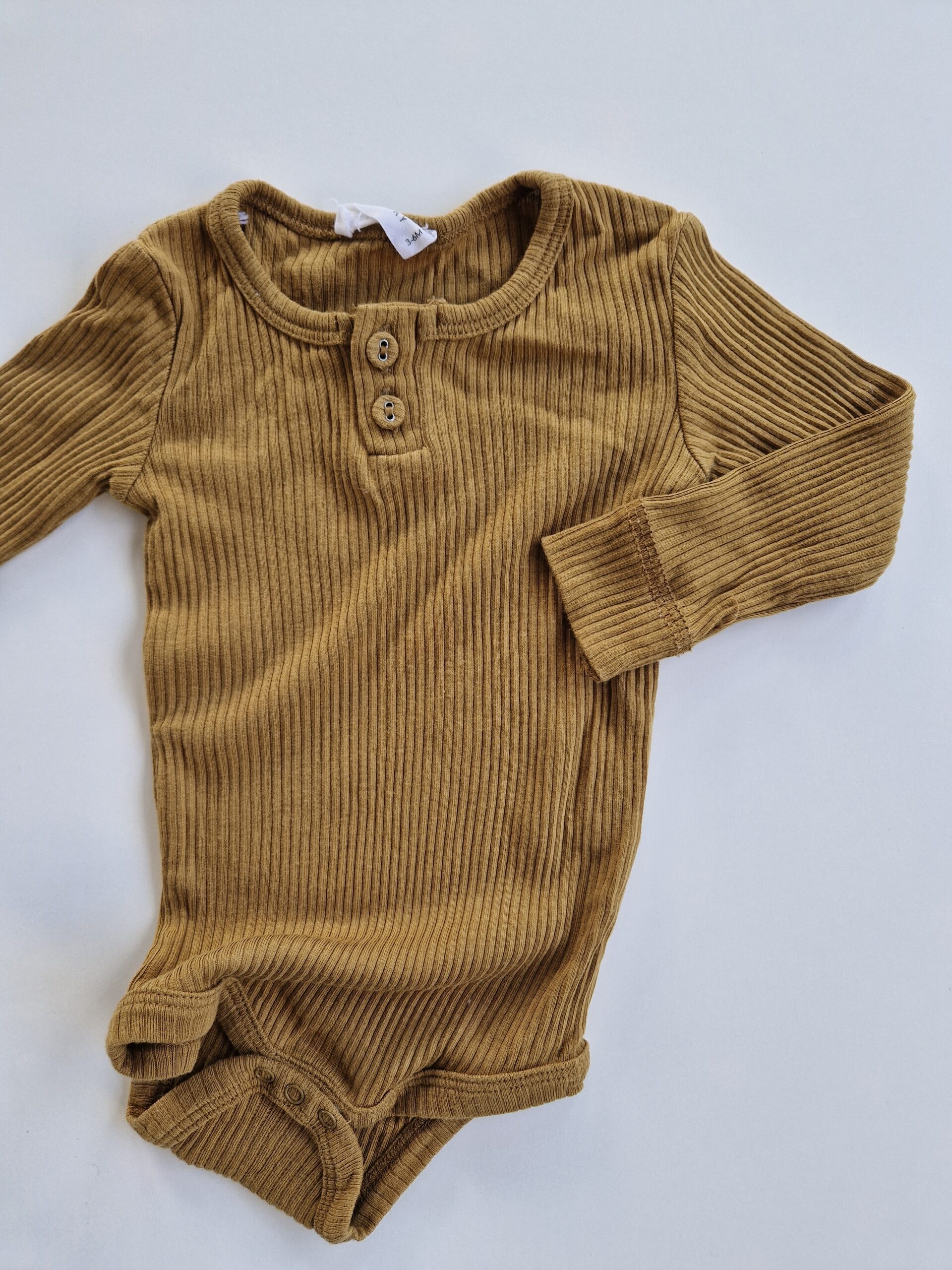Bra skick. Ribbad, mjuk bomull med klädda knappar. Ockrafärgad nyans.