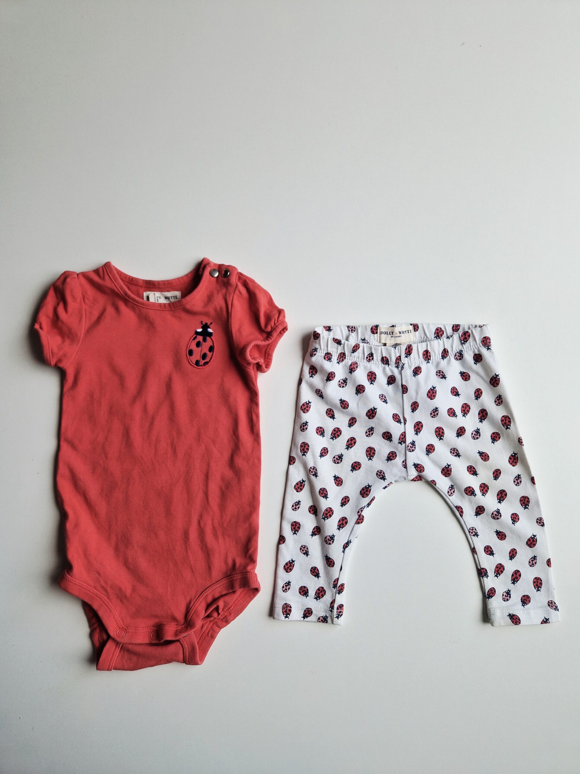 Set i mycket fint skick. Bomull med broderad nyckelpiga på bodyn och med volangärm . Rymlig passform som gör att plagget kan användas längre.