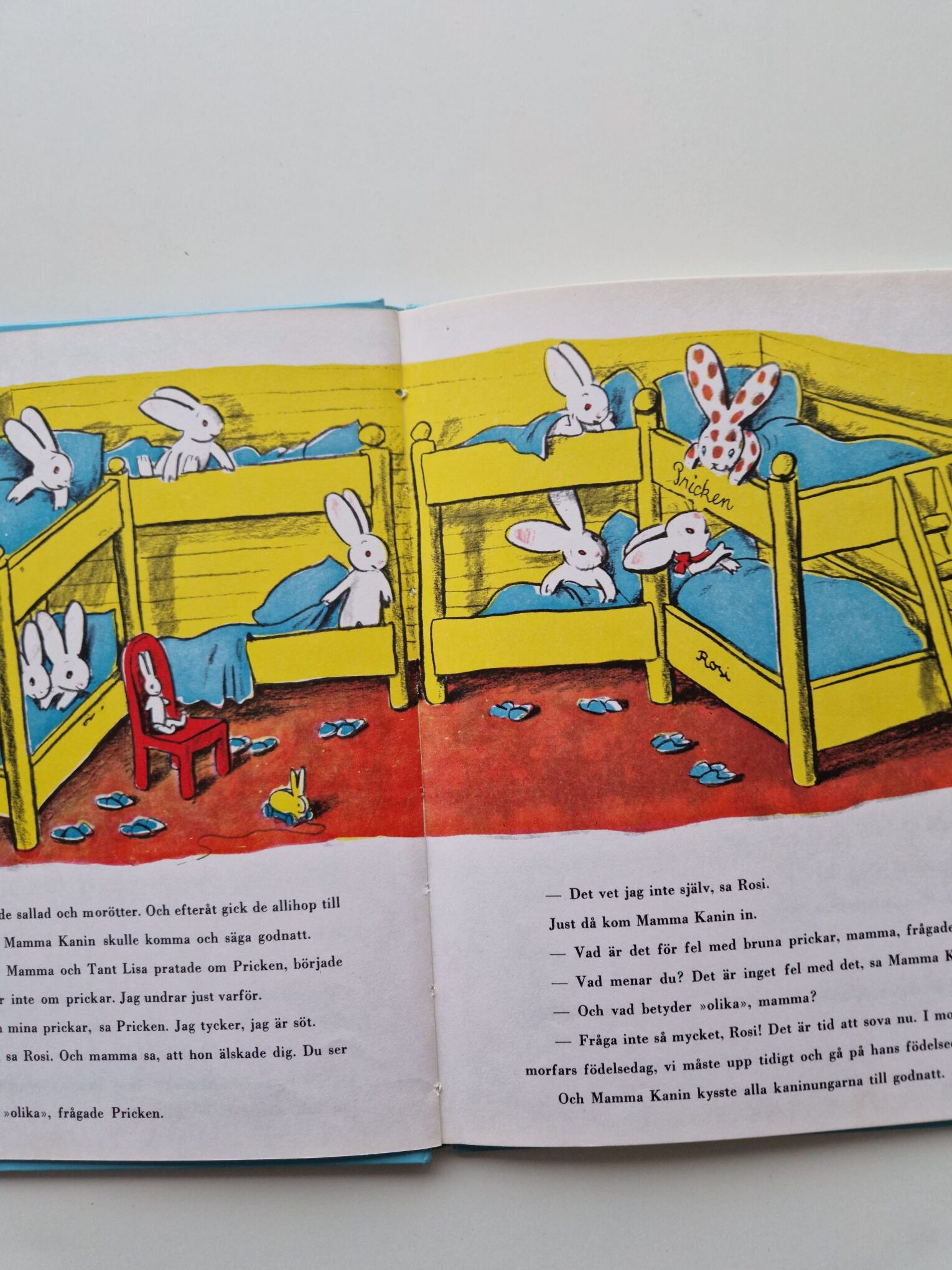 En älskad klassiker om kaninungen som föds annorlunda och känner sig utanför – en berättelse som både värmer och svider lite i hjärtat. Rey-parets språk och fina illustrationer gör boken till en tidlös favorit om identitet, ensamhet och att hitta sin plats. Passar fint från ca 3 år och uppåt. Bra begagnat skick. Tjocka fina blad, lätt nött på pärmen. Ca 24 cm hög.