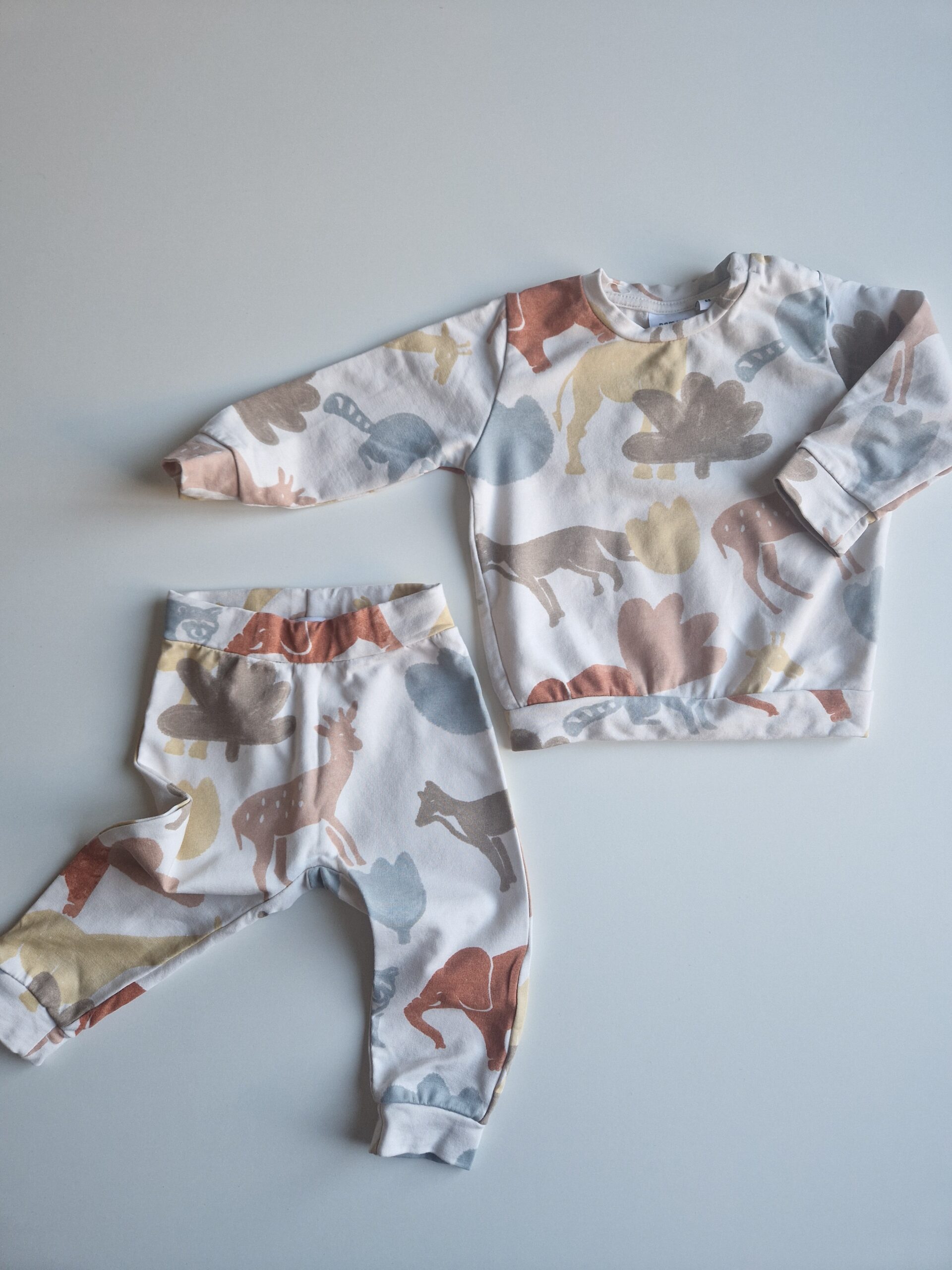 Matchande set i mjuk bomull från Name It, i dov färgskala med ett fint motiv. Byxorna har reglerbar midja för bra passform och lång användningstid. Mycket fint skick.