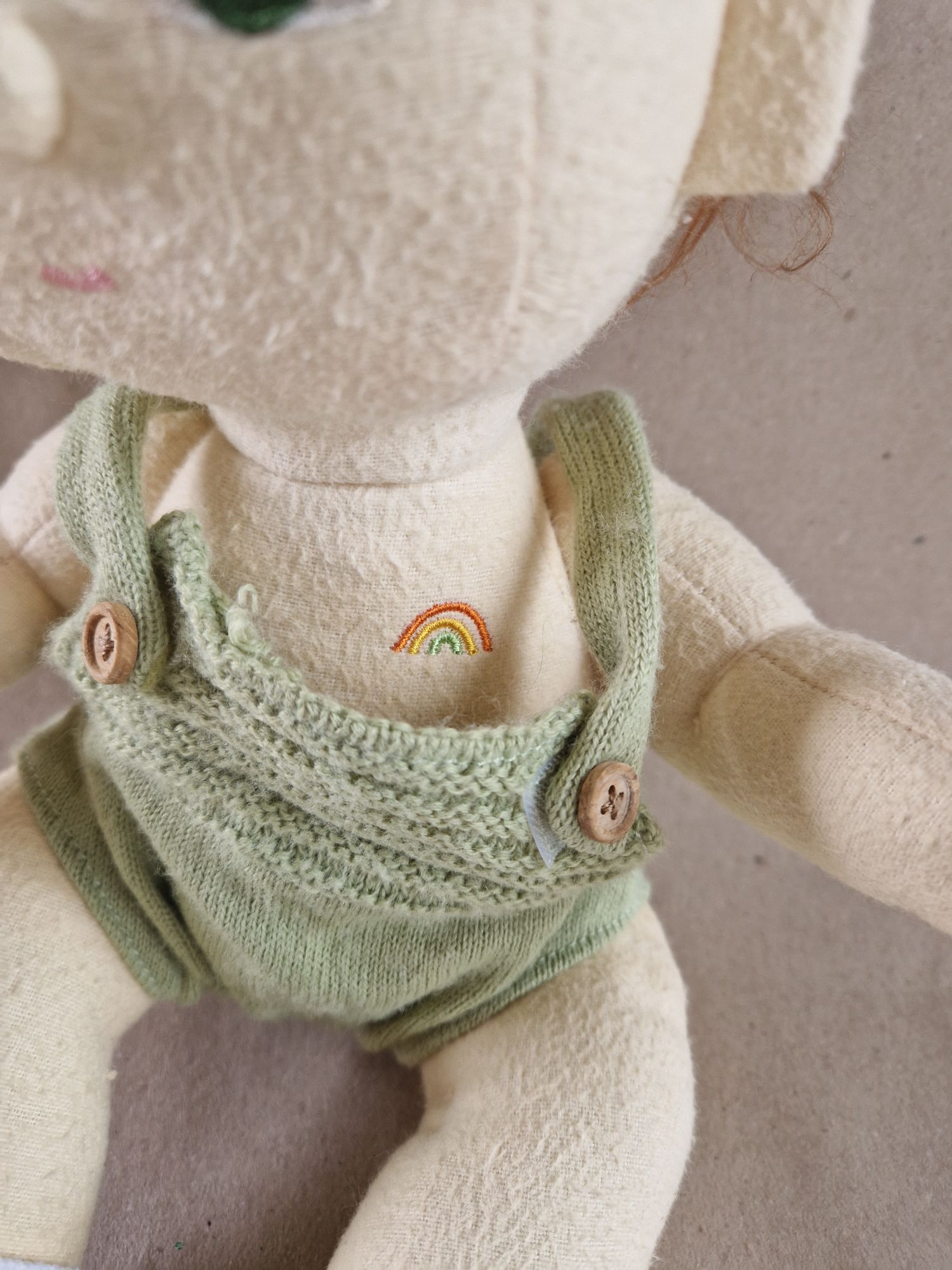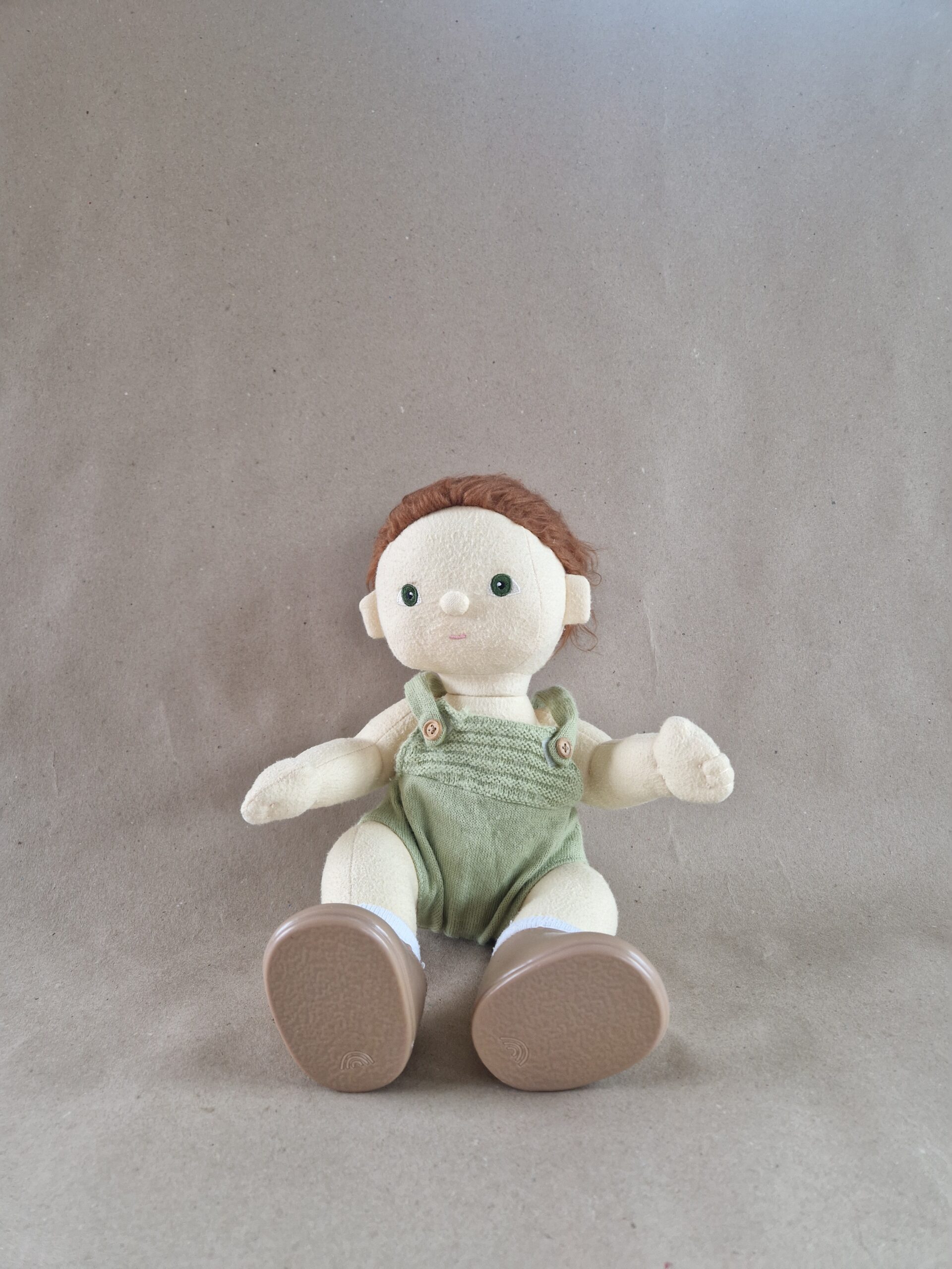 Den är tillverkad i mjuk bomull med allergivänlig fyllning. Dockan kommer klädd i en avtagbar romper med kardborre och träknappar, samt strumpor och skor.