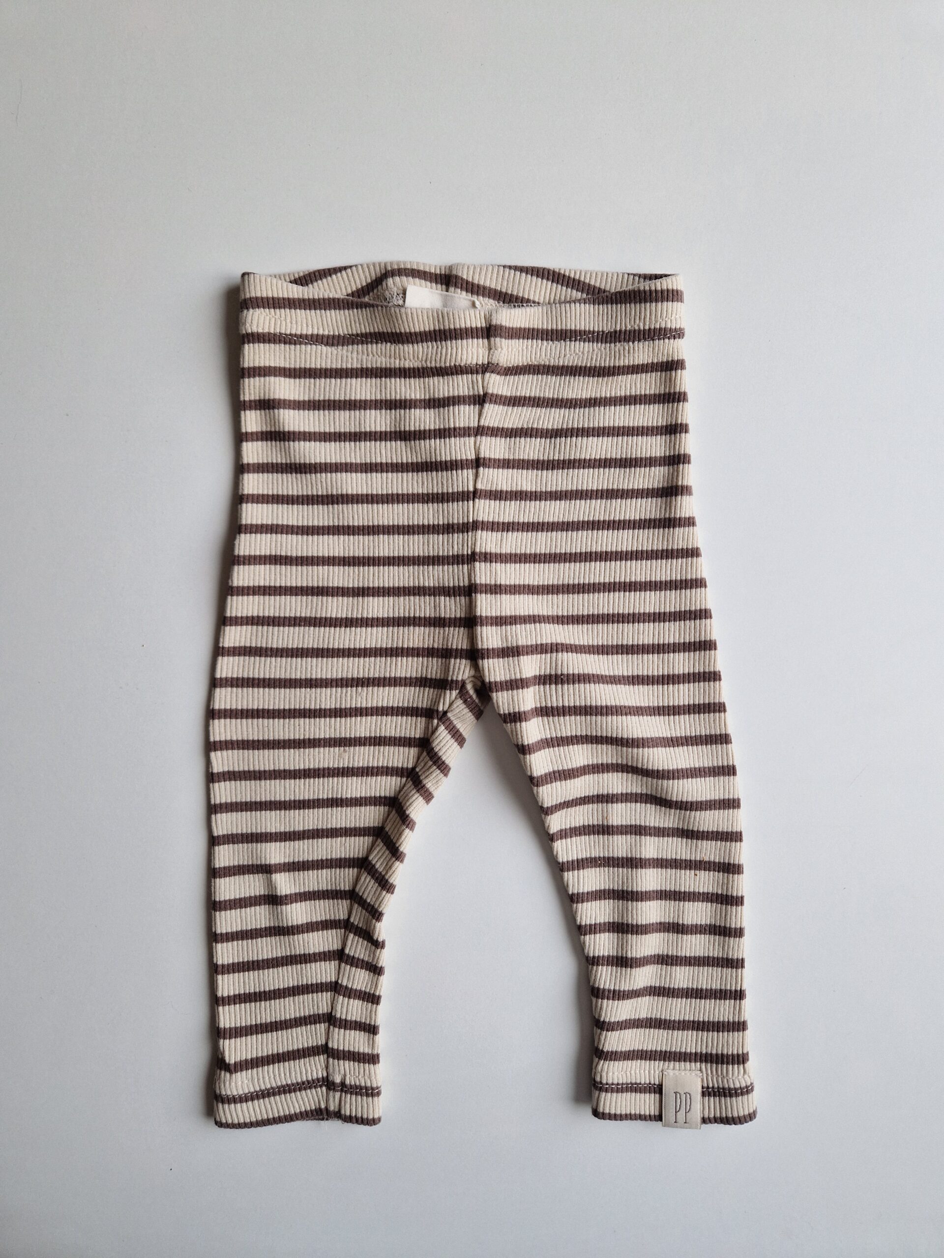 Mycket fint skick. Ribbade leggings i mjuk bomull i sandfärgad ton med bruna ränder. Fin liten Petit Piao etikett vid foten. Fint plagg från det danska kvalitetsmärket.