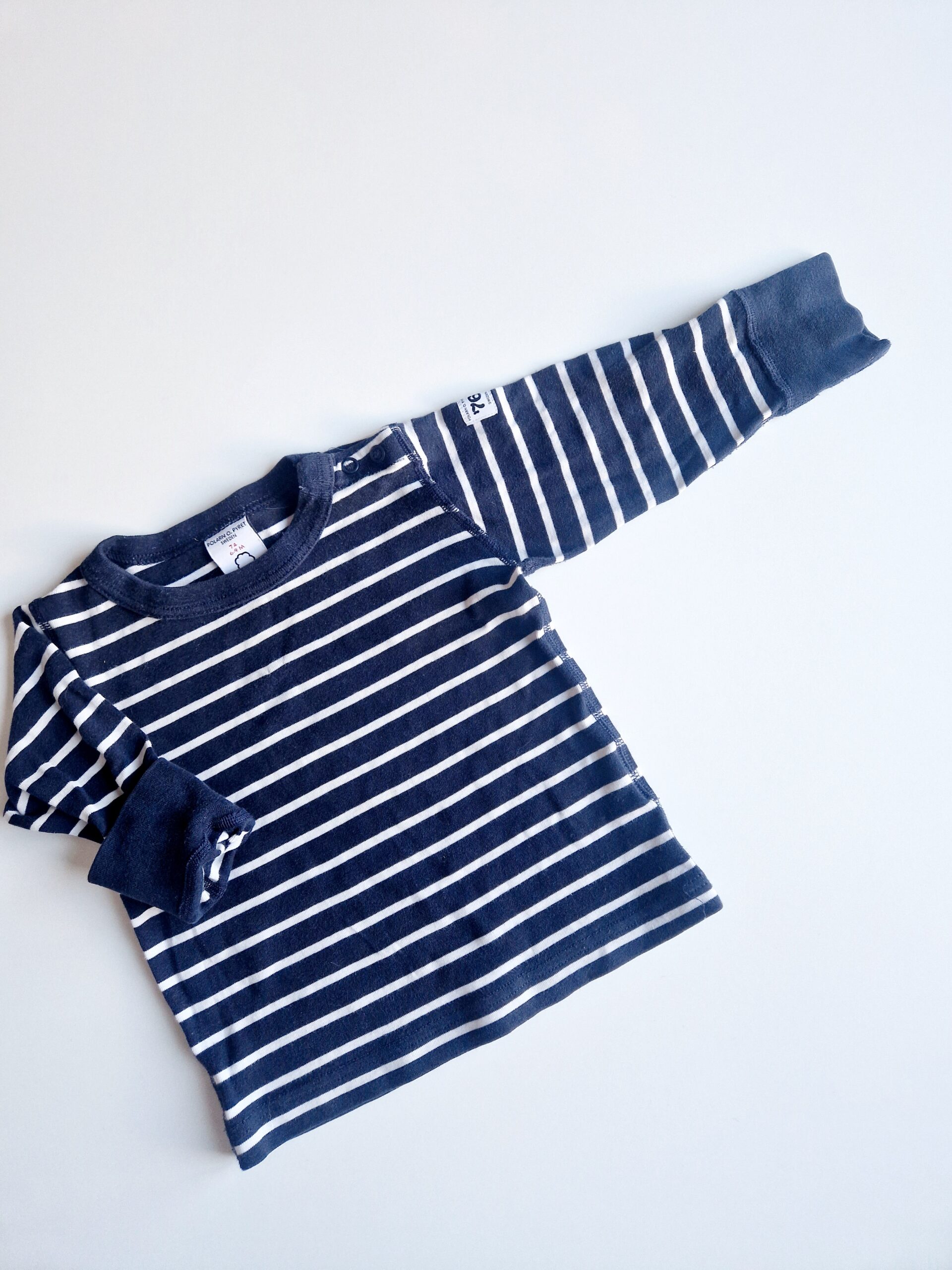Randig tröja från POP i blått och vitt, i mjuk bomullskvalitet. Fint begagnat skick. Det finns ett litet märke där det troligen suttit ett larm – ingen skada i tyget och inget hål, men en liten prick som inte går att stryka bort.