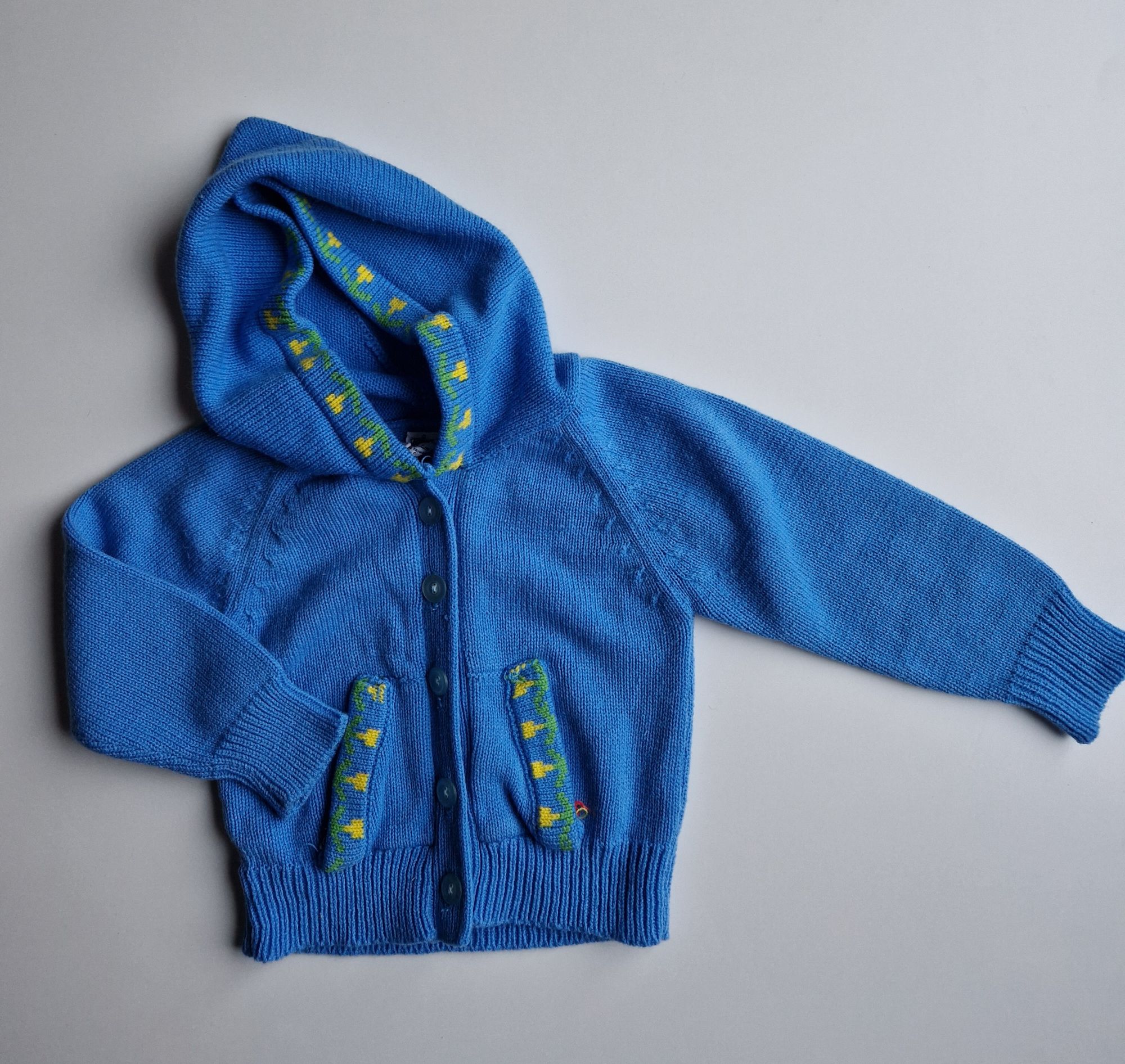 Riktigt vintage med cool lapp där det står 3 år men är nog mer 2,5 år mot 3. Mjukaste koftan (akryl) och med broderier på fickor mm- jag får känsla av tulpaner. Fint skick.