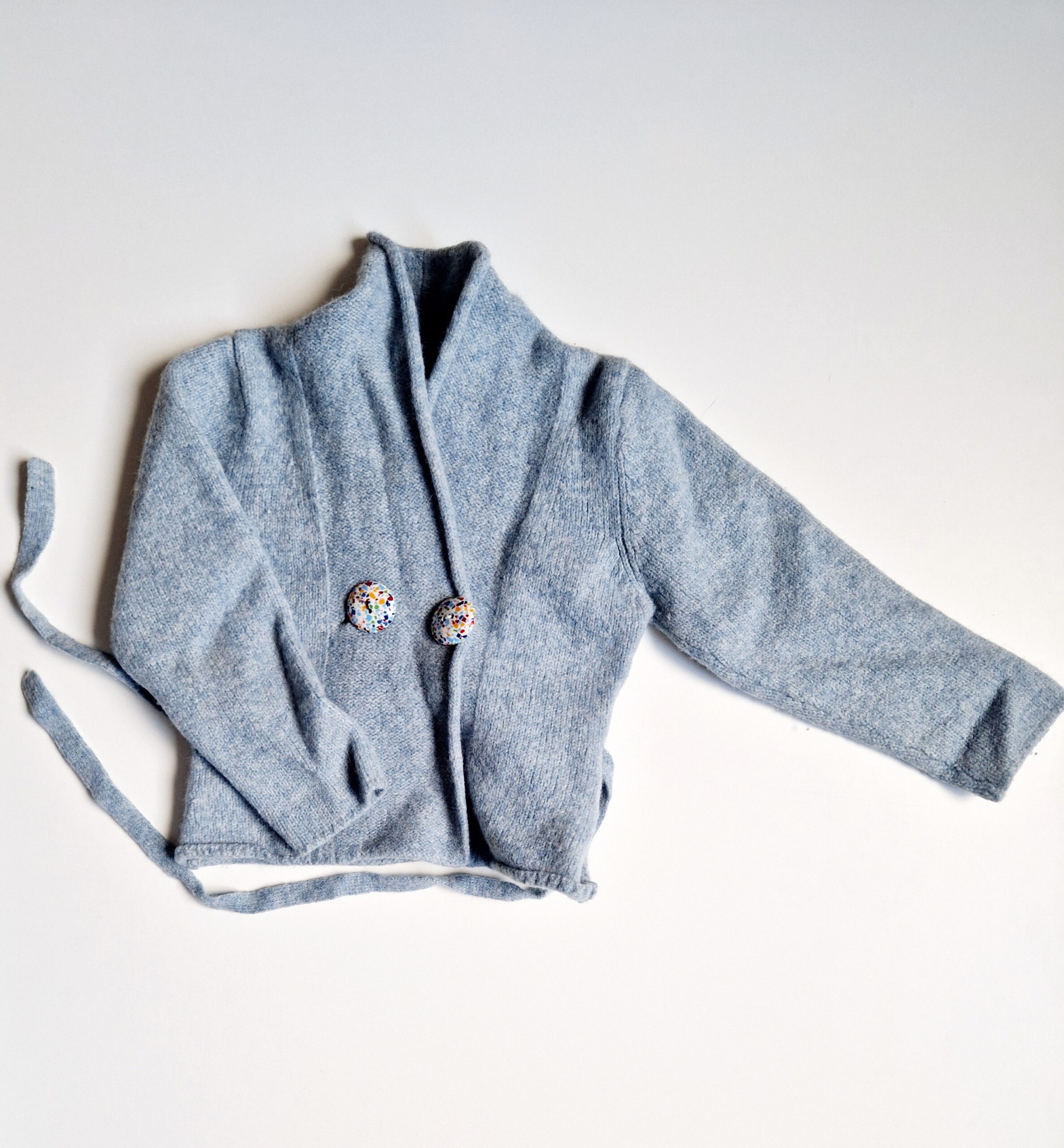 Duvblå kofta i 80% ull och 20% nylon. Duvblå och känns på lappen som fin design från förr. Något krympt och är 4 år men passar bättre 3 år. Teres har bytt knappar till ett par coola glada. Ett litet fynd detta!